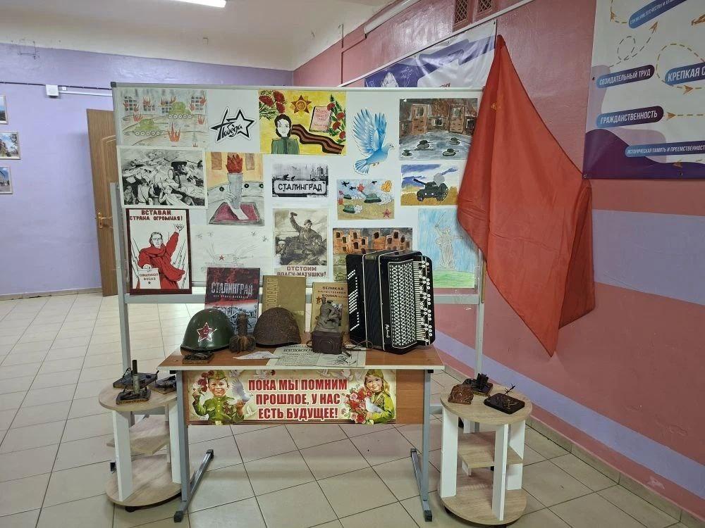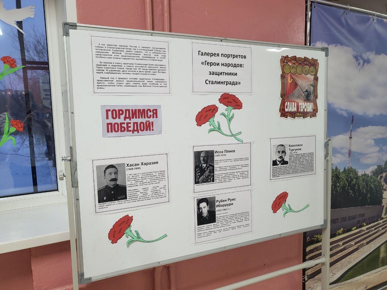 галерея портретов «Герои народов: защитники Сталинграда» (стенд с портретами оформили члены Совета старшеклассников. О героях Сталинградской битвы – представителях братских народов читайте здесь: