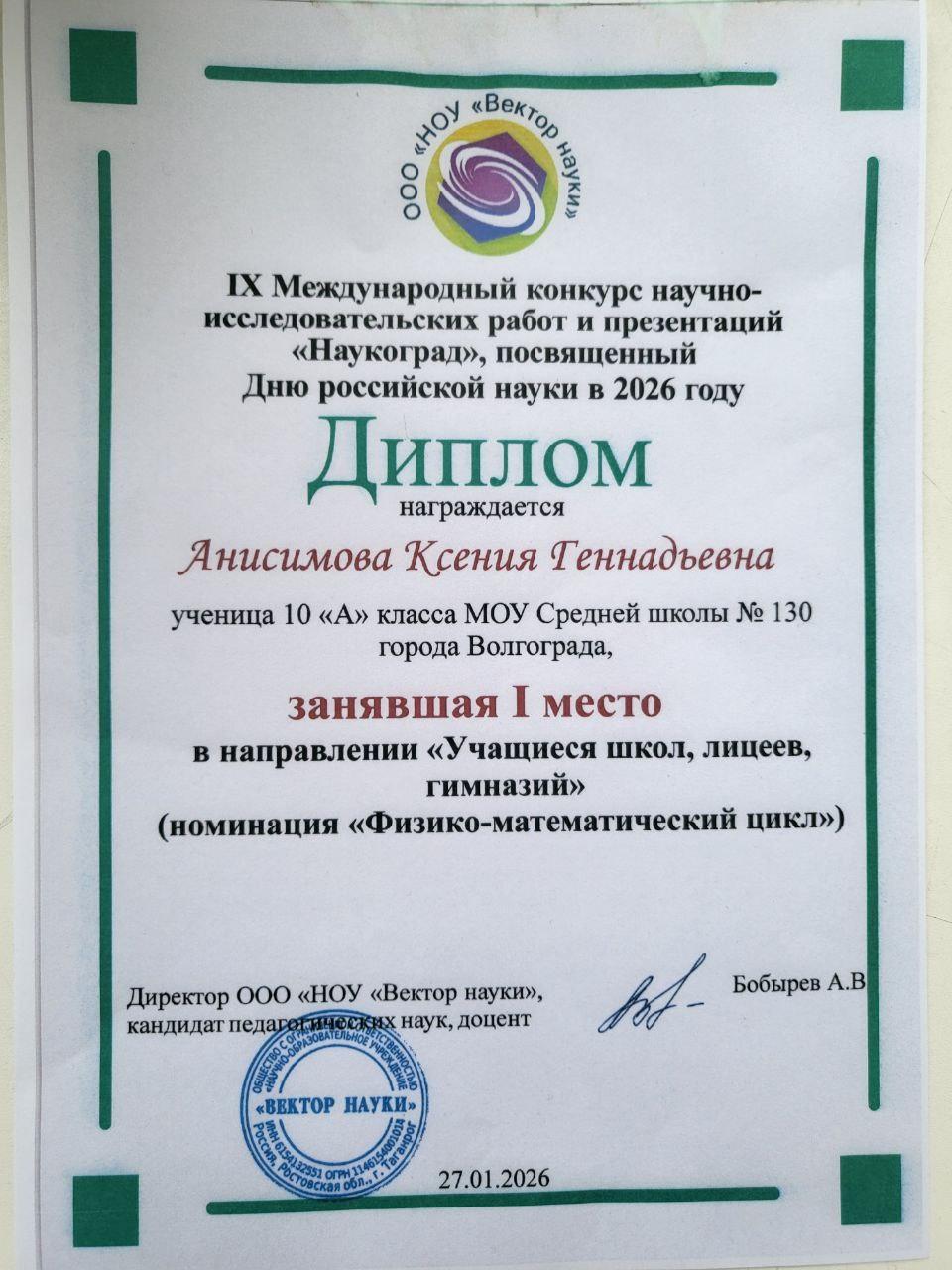 🧲Анисимова Ксения, 10А класс, выиграла конкурс научно-исследовательских работ и презентаций "Наукоград"!