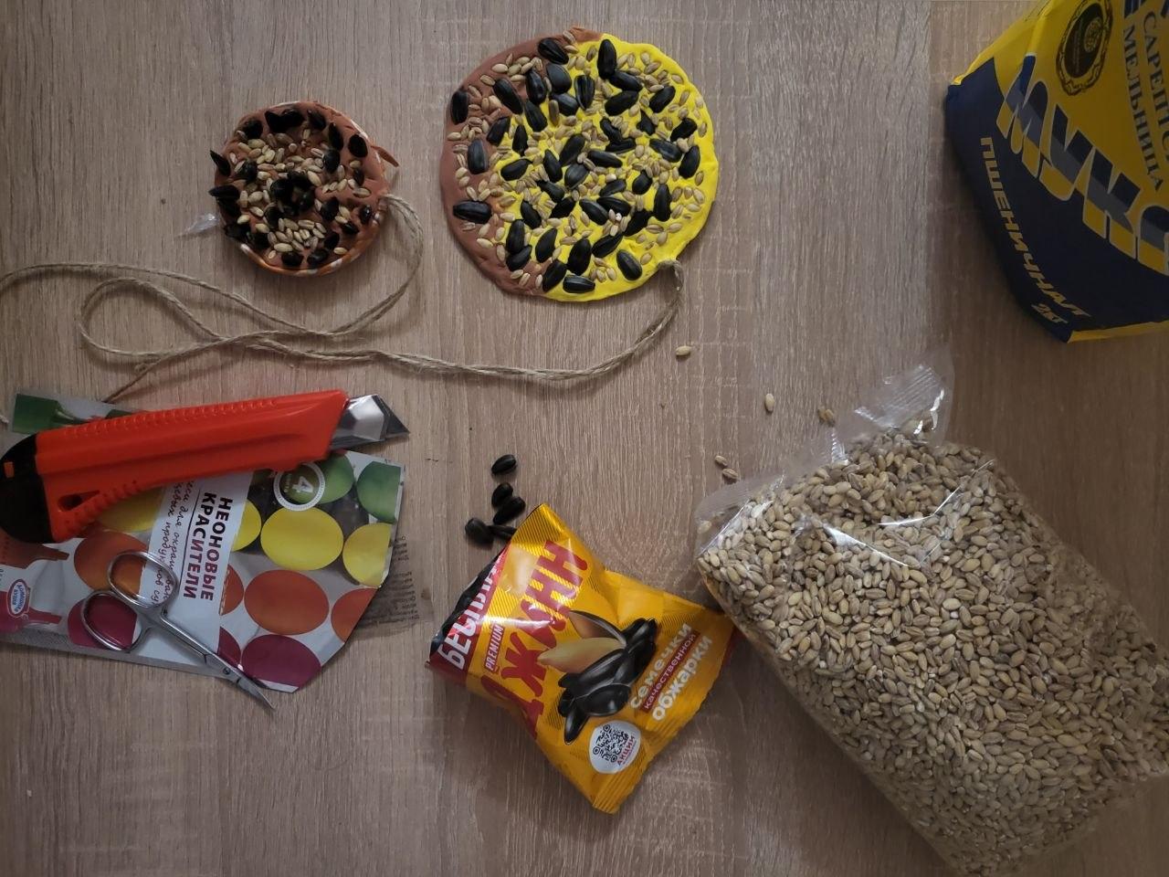 Перед проведением акции ребята выяснили, что хорошим кормом для птиц являются семечки, крупы, сухофрукты и даже несоленое сало. А еще узнали о способах кормления пернатых: можно просто рассыпать корм по земле или асфальту, а можно изготовить кормушки, соорудить съедобные гирлянды или сделать что-то нестандартное. Было принято решение заместить подкрашенное пищевым красителем тесто, обернуть его вокруг картонных кружочков, насыпать на тесто крупу и семечки.