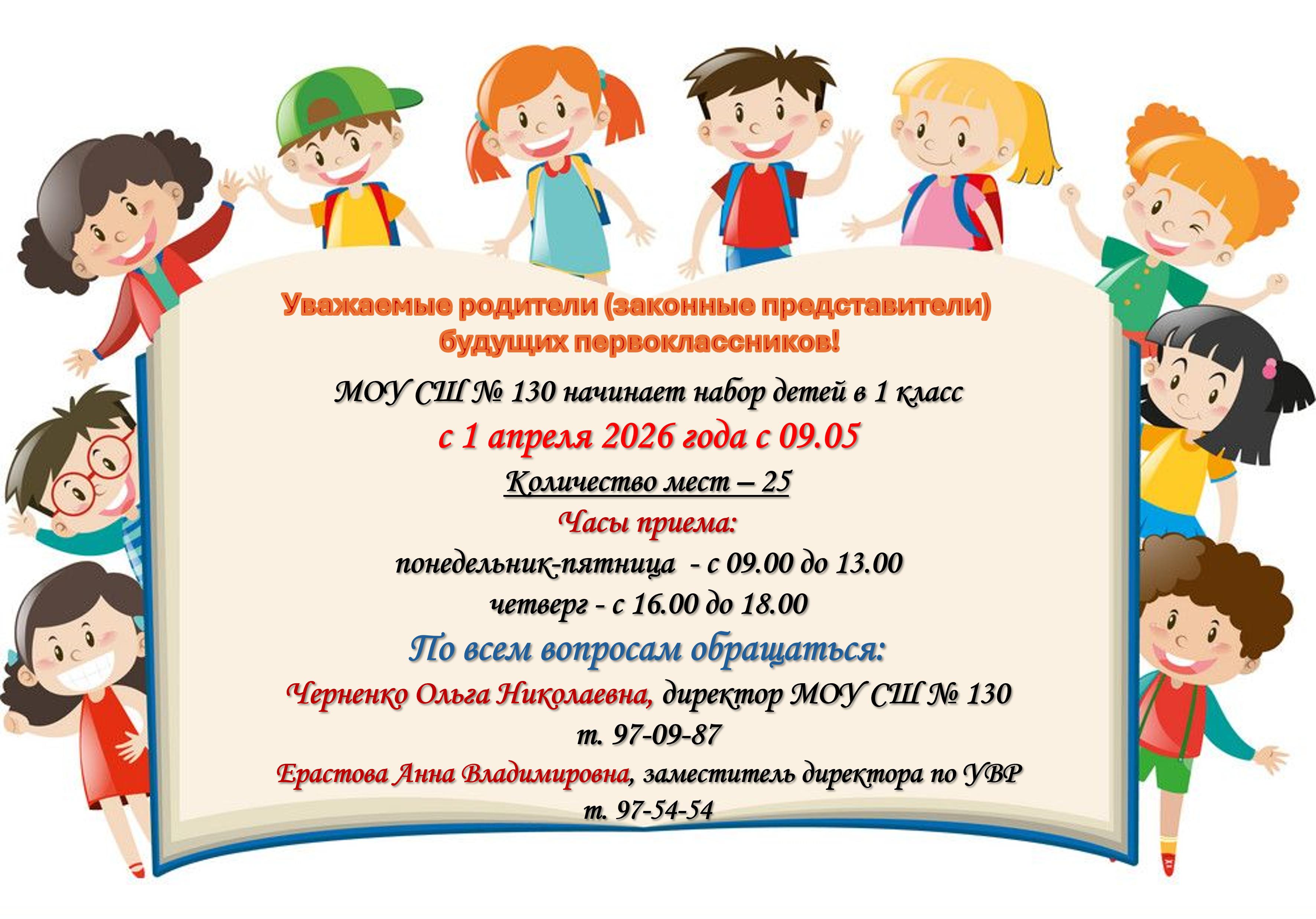 Обращаем Ваше внимание, что приему в первый класс МОУ СШ № 130 на 2026-2027 учебный год подлежат дети в возрасте не менее шести лет шести месяцев и не старше восьми лет на 01.09.2026. Дети иного возраста, претендующие на зачисление в первый класс, могут быть приняты на основании согласования Ворошиловского территориального управления департамента по образованию администрации Волгограда.